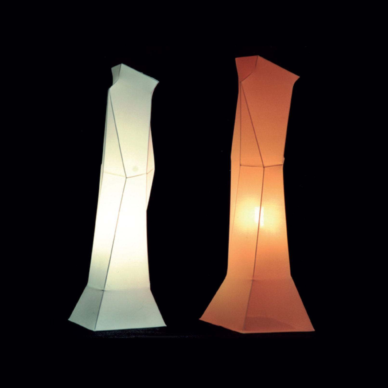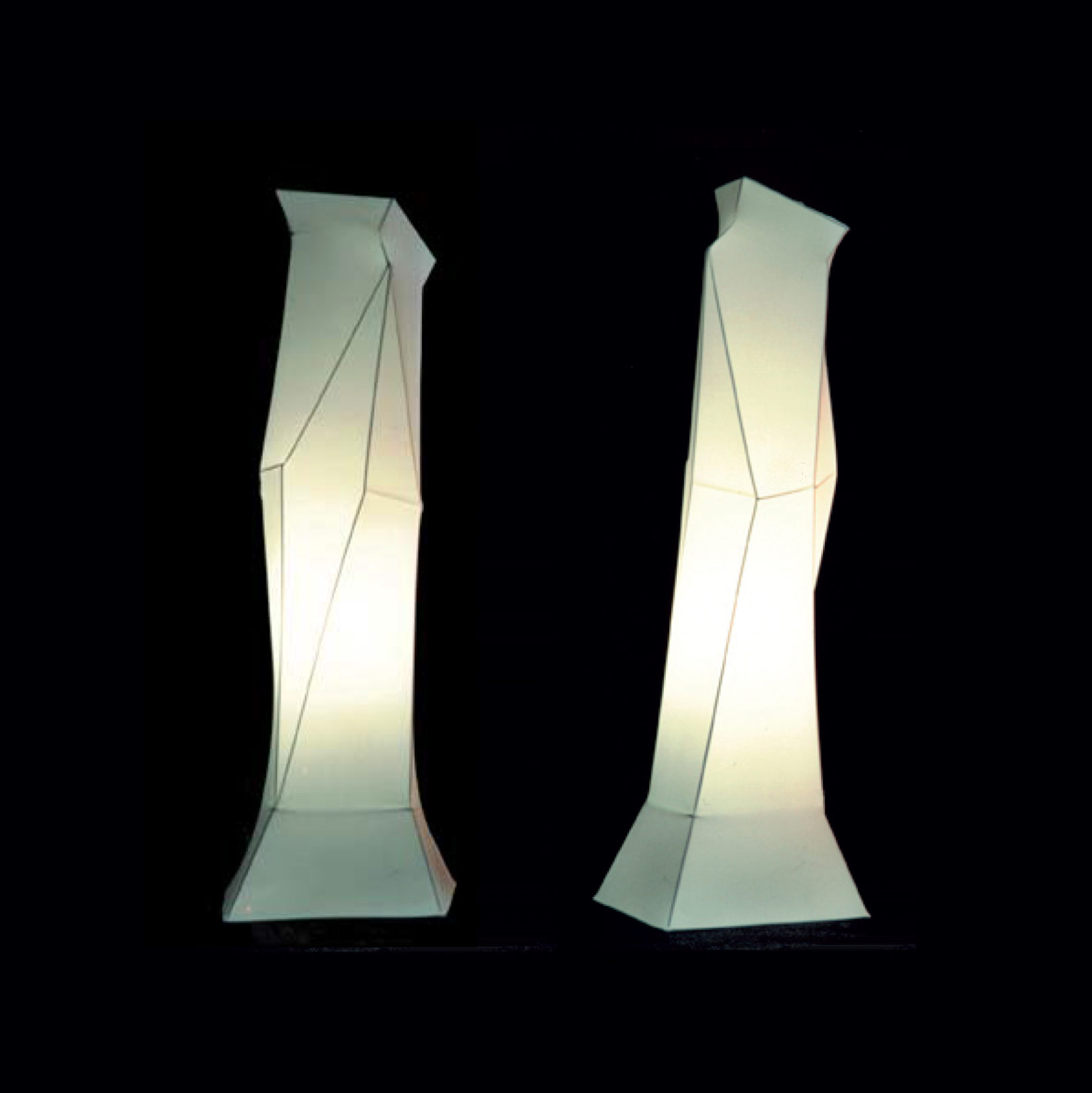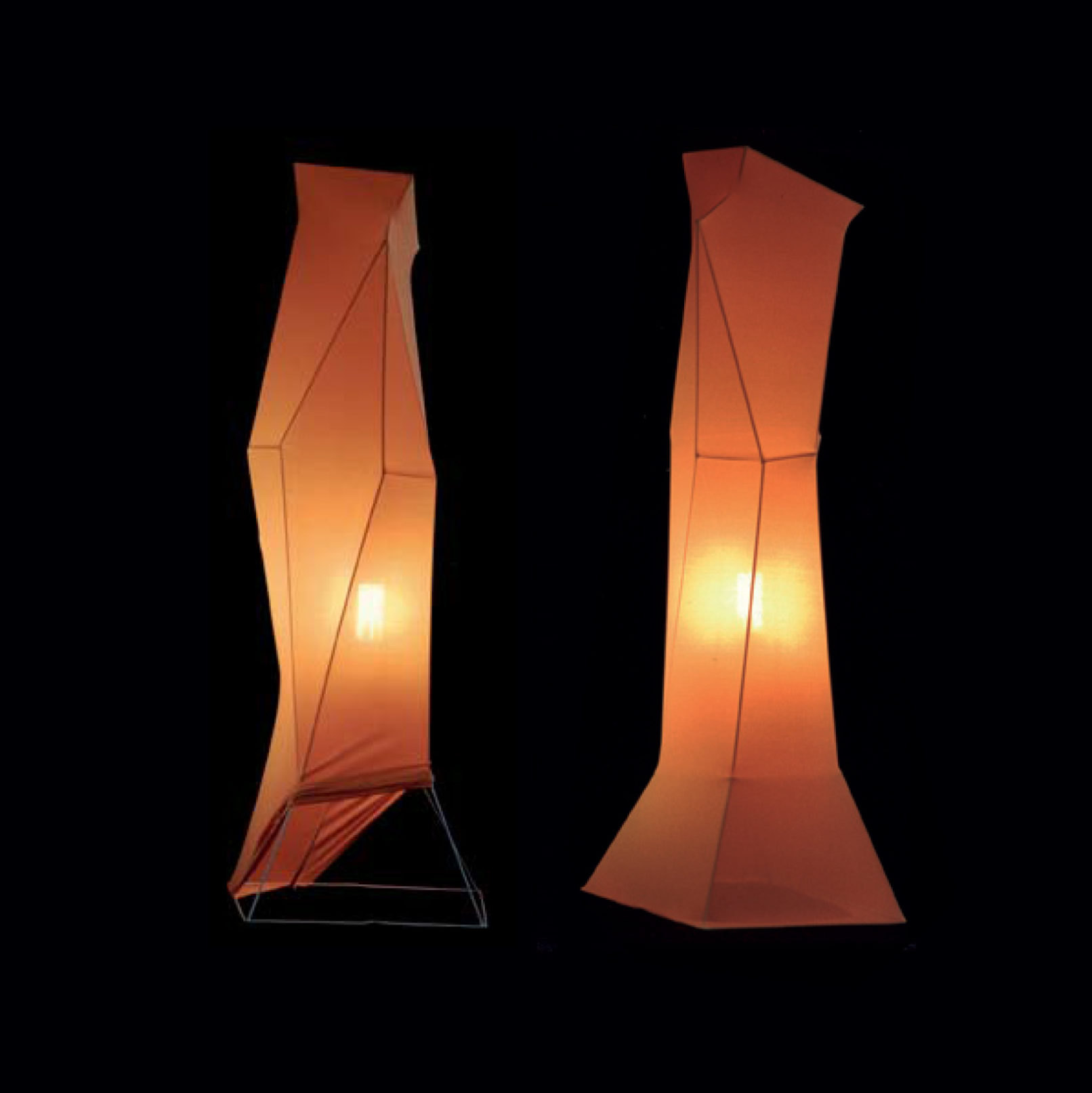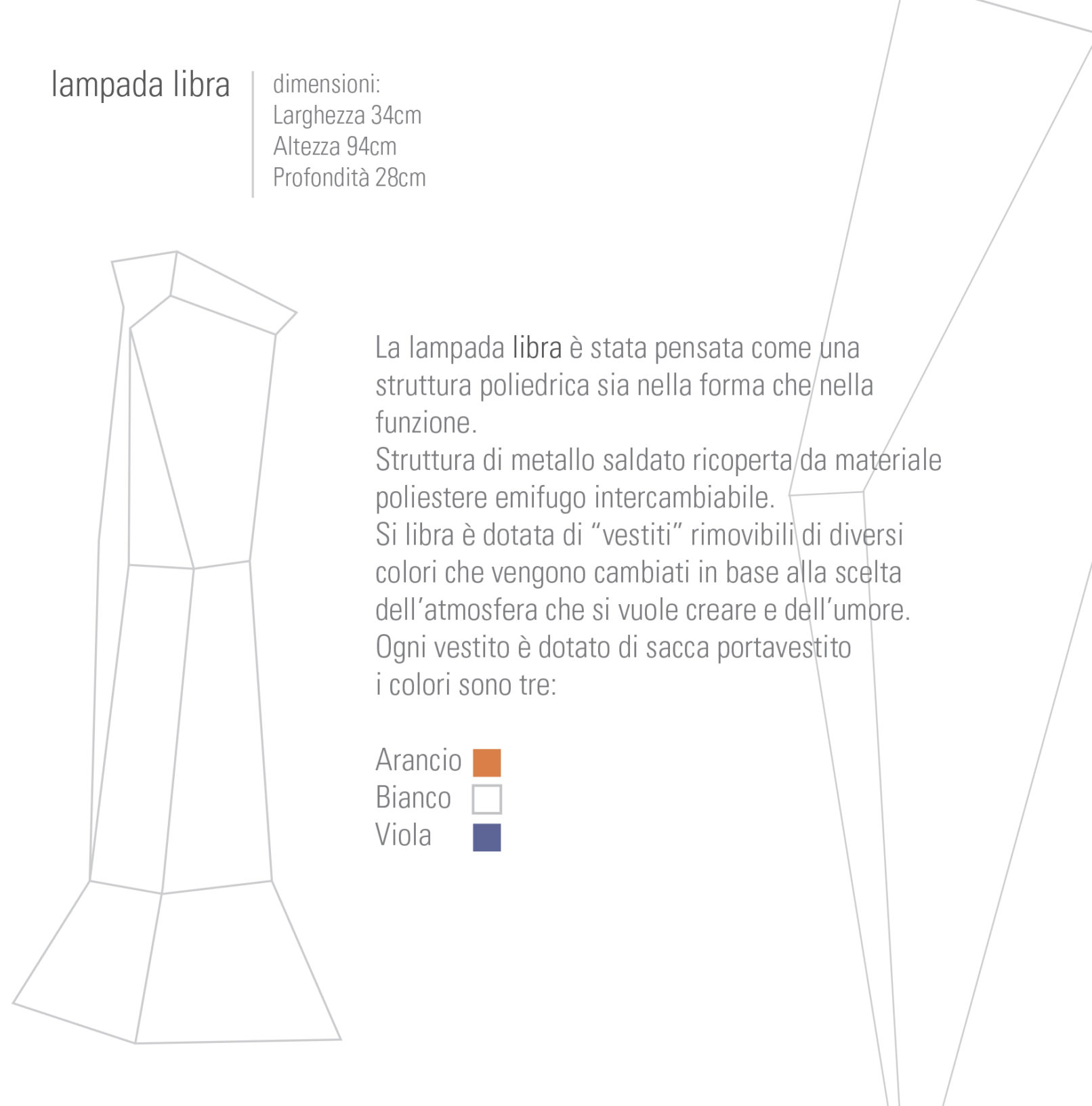 Lampada Libra è stata pensata come una struttura poliedrica sia nella forma che nella funzione. Struttura di metallo saldato ricoperta da materiale poliestere emifugo intercambiabile. Si libra è dotata di “vestiti” rimovibili di diversi colori che vengono cambiati in base alla scelta dell’atmosfera che si vuole creare e dell’umore. Ogni vestito è dotato di sacca portavestito i colori sono tre: arancio, bianco e viola.